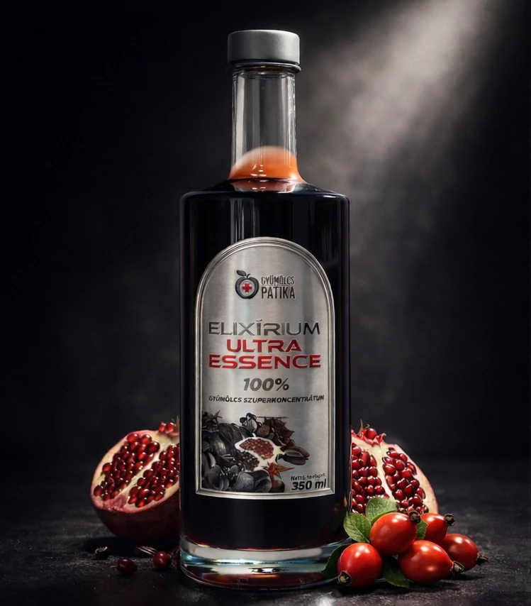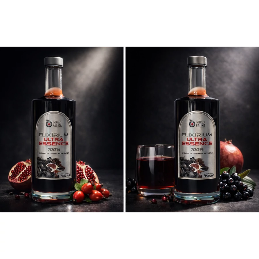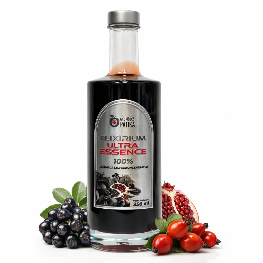 Az Elixírium Ultra Essence egy kimagasló hatóanyagtartalmú, prémium minőségű gyümölcskoncentrátum, amely három kiemelkedő szupergyümölcs – arónia, csipkebogyó és gránátalma – esszenciáját egyesíti.