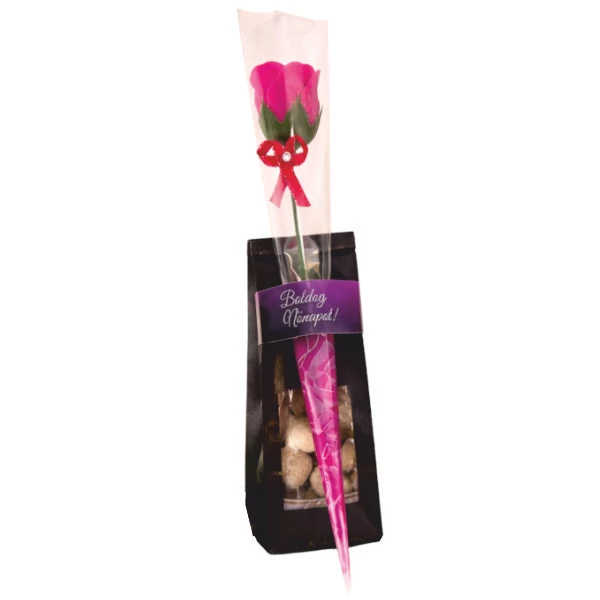 A csomag tartalma: Fekete papírtasakban, kézműves bonbon csomag 60g, szappanrózsa
